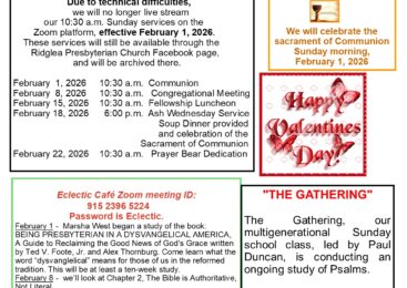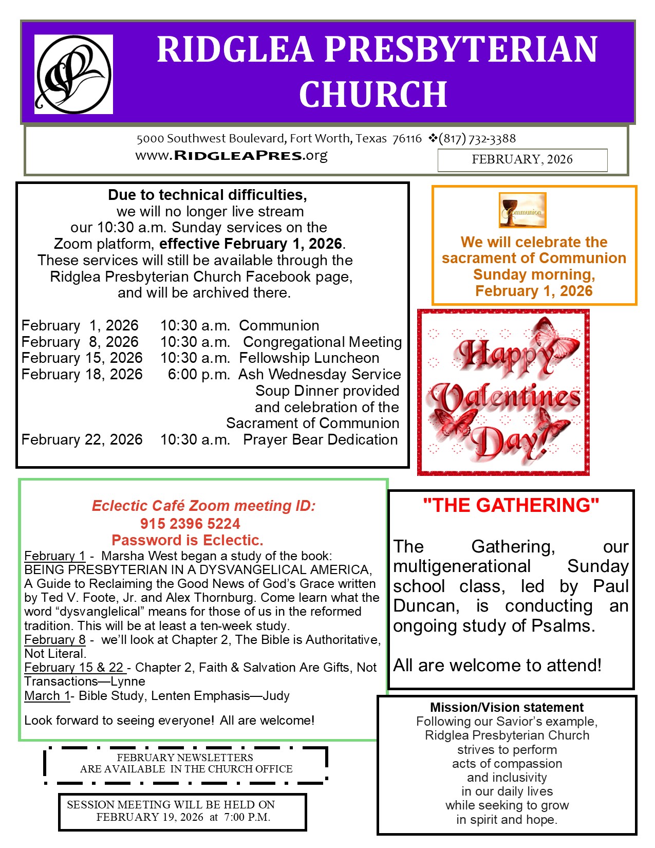Due to the impending winter weather, Ridglea Presbyterian Church is cancelling all events this Sunday, January 25th, including all classes, childcare, music and the Service of Worship. The Annual Congregational Meeting will be rescheduled for a later date.